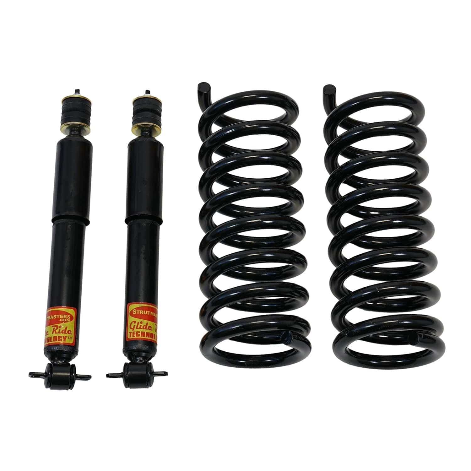 The Strutmasters Front Replacement Coil Springs And Shocks are perfect for aging, high-mileage vehicles. Since coil springs support the weight of the vehicle and shocks control the ride, this kit is just what you need to start riding great again! These are high quality, American-Made front replacement coil springs designed just for your vehicle. The new front springs will help restore you to the correct ride height, while new shocks will smooth out the lumps and bumps of every day driving. This product is the perfect compliment to vehicles already using our rear air suspension conversion kit. Strutmasters has been the industry leader in money-saving suspension conversion kits that ride better than anything else out there. Don't settle for less, choose the best -- Strutmasters!